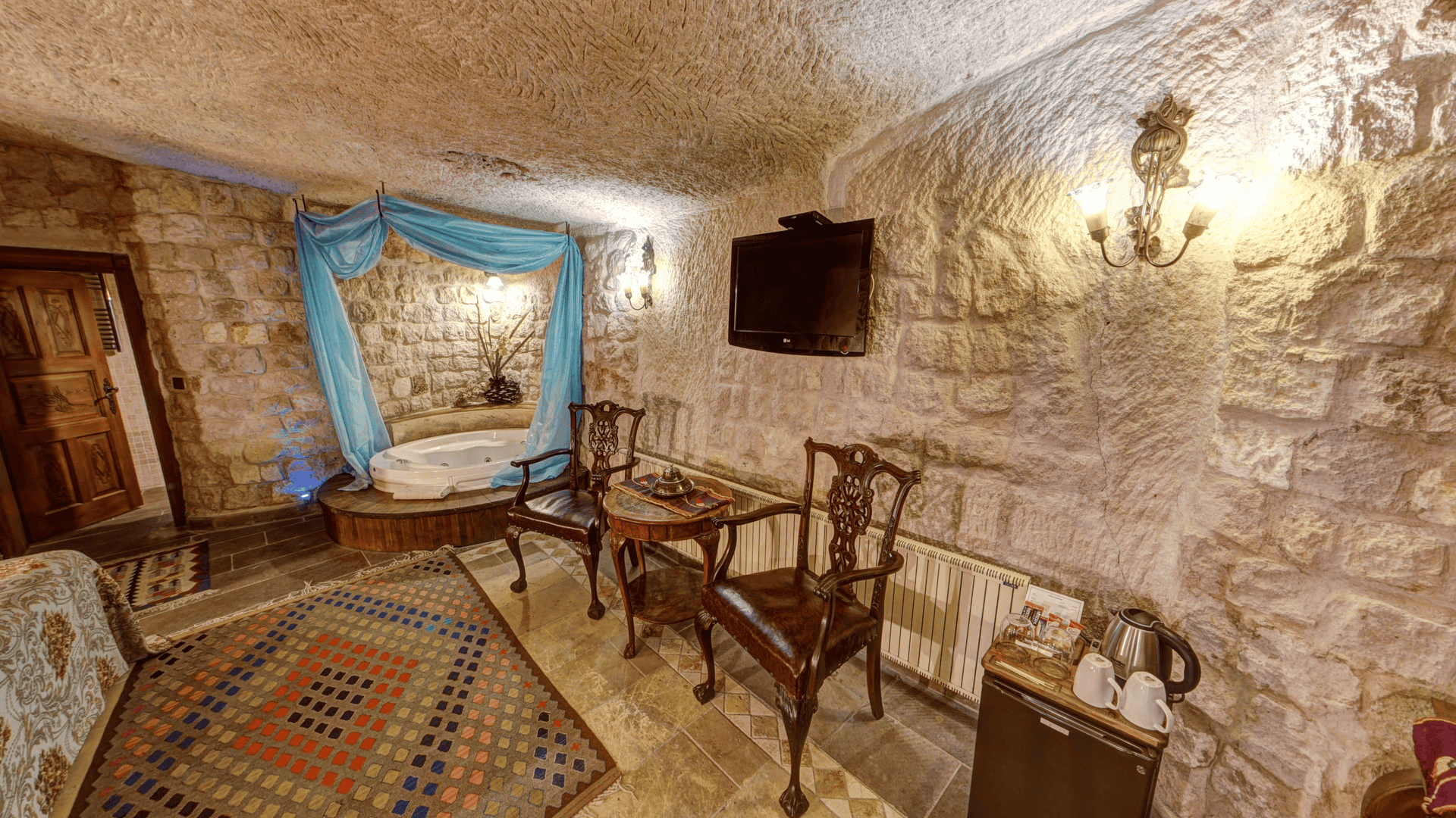 All 8 rooms have independent doors opening to the terrace. You can enjoy the unique view of Göreme from each room. Miras Hotel features 8 cave-carved rooms, each meticulously decorated with our guests' comfort and convenience in mind. It offers 3 Deluxe Suites and 5 Deluxe Rooms, each with its own unique features. Our rooms are designed for double occupancy, and they are non-smoking. The rooms also showcase remarkable carvings, handcrafted by a skilled stonemason. Miras Hotel, presenting the cave hotel experience from a different perspective, invites you to explore as every door opens to a different world.
